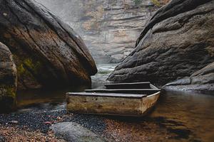 Simply constructed boat that has been abandoned fifty meters down river from a giant waterfall.